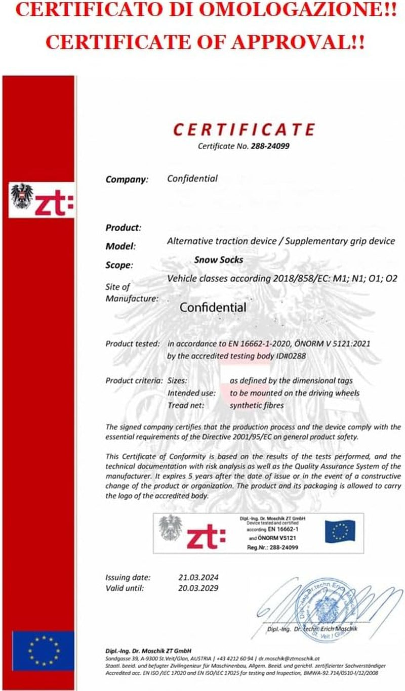 DESCRIZIONE E CARATTERISTICHE PRODOTTO: -COPPIA DI CALZE DA NEVE OMOLOGATE = 2PEZZI!!! -CERTIFICATO DI OMOLOGAZIONE NELLA FOTO!! -NUOVA TEXTURE 3D -TESSUTO HIGH QUALITY -Calze da neve adatte a tutti i veicoli con poco spazio tra ruota, carrozzeria ed ammortizzatori -Autocentranti, non danneggiano i cerchi -Efficicenti nei sistemi elettronici di sicurezza (ESP, ABS, DSC,...) -Facili da riporre, sicure, riutilizzabili e lavabili -Le calze sono un perfetto kit di sicurezza per la guida su strade innevate e ghiacciate, sviluppate per la guida a breve e lunga distanza su strade asfaltate innevate e ghiacciate.