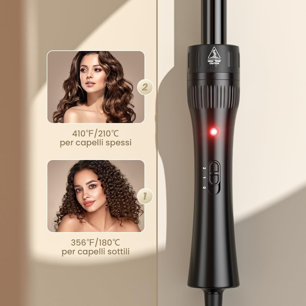 - DUE TEMPERATURE REGOLABILI: Regola la temperatura da 180°C a 210°C premendo un pulsante e scegli la temperatura più adatta ai tuoi capelli, la prima temperatura è per capelli più morbidi e la seconda temperatura è per capelli più duri
