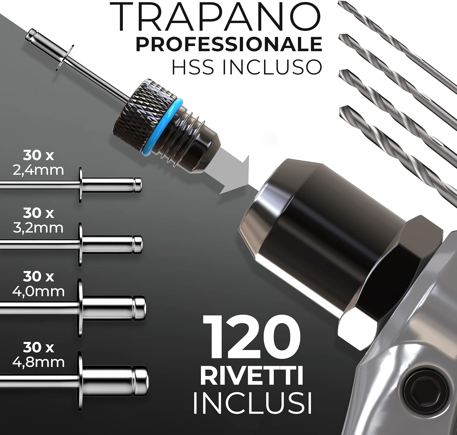✅ 120 rivetti e 4 perforatori HSS INCLUSI - Niente ostacola il tuo lavoro. Il set di pinze per rivetti include 30 rivetti delle seguenti dimensioni: 2,4mm / 3,2mm / 4,0mm / 4,8mm